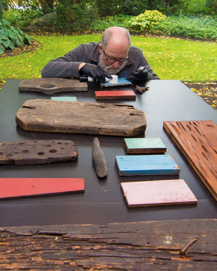 Conservator Ron Koenig with Girard Mural Components (before restoration)